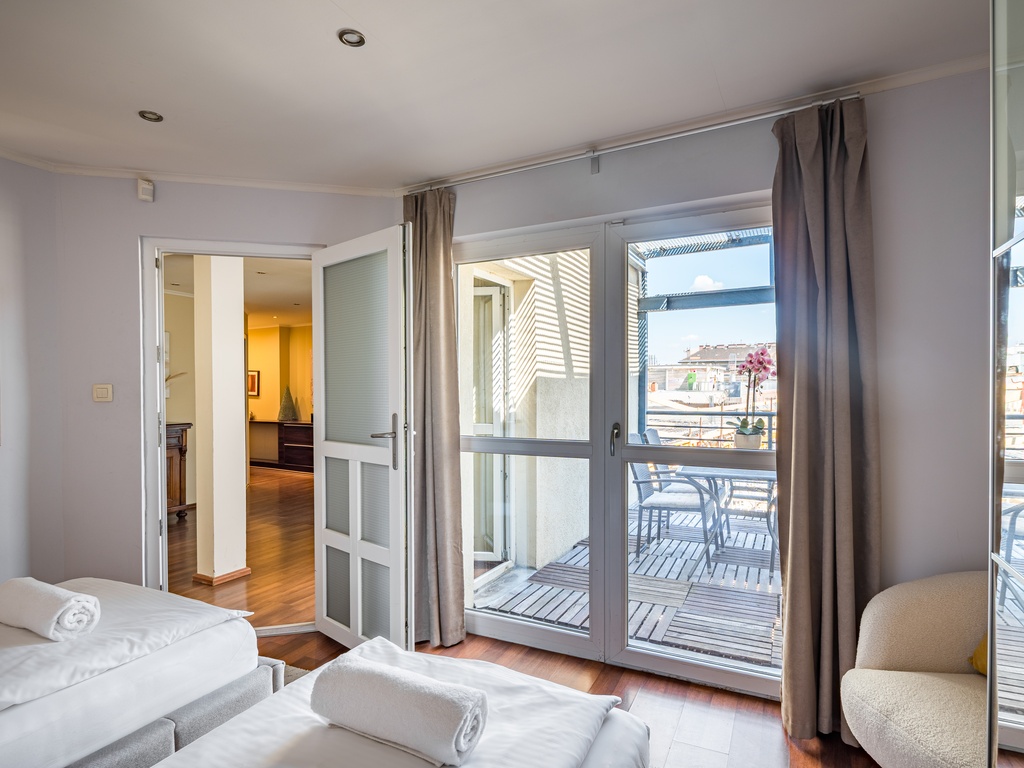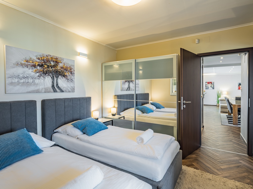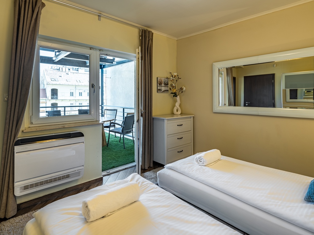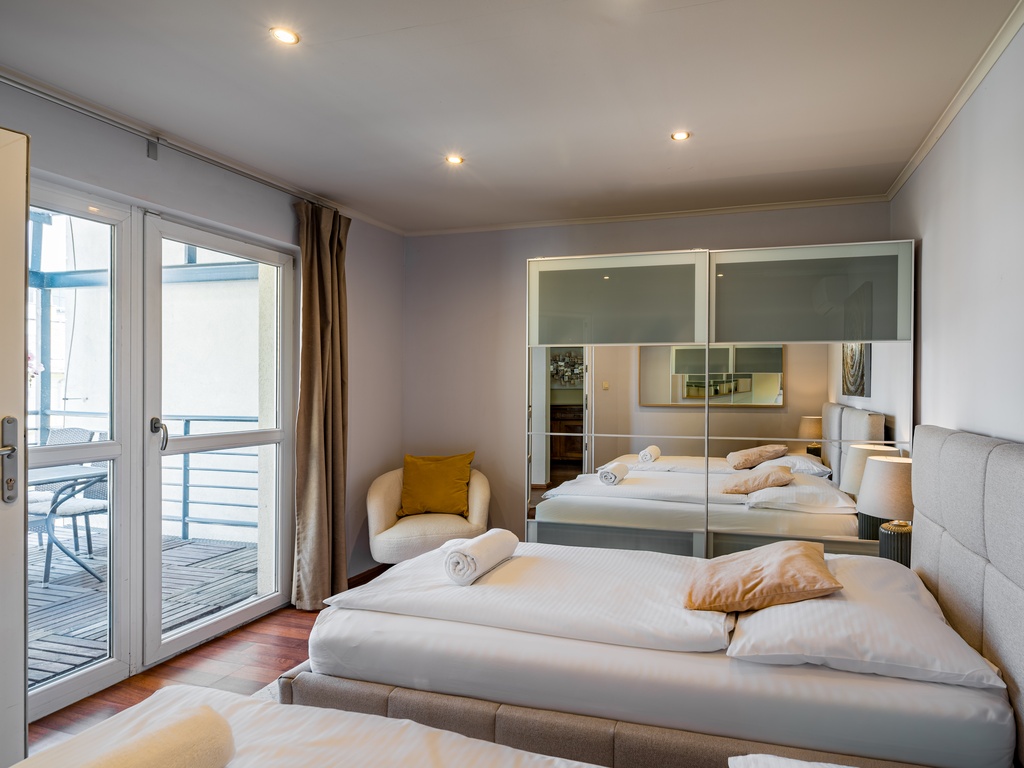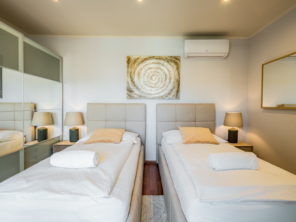 Az első szinten egy, a második szinten három tágas hálószoba található, mindegyik kétszemélyes ággyal, tolóajtós szekrénnyel, éjjeliszekrényekkel berendezve. A hálószobák teraszai zöld udvarra néznek. A lakásban három komplett fürdőszoba található, egy az alsó szinten, kettő a másodikon. A tetőterasz grillezésre, étkezésre, napozásra alkalmas. Felszereltsége teljes mértékben kiszolgálja a pihenést és a kulturált szórakozást.